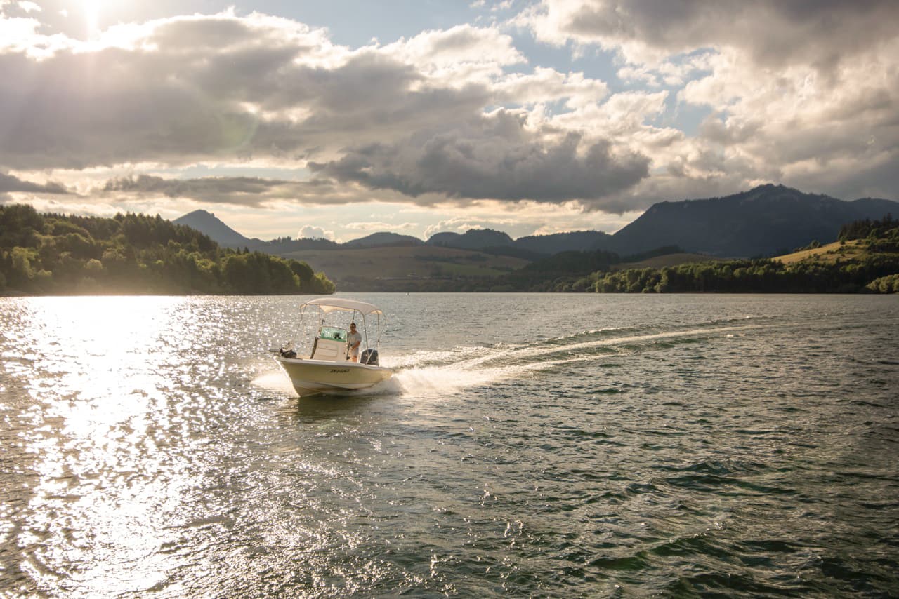 Ľahký hliníkový čln so spoľahlivým motorom na pohodlné vychádzky po vode.